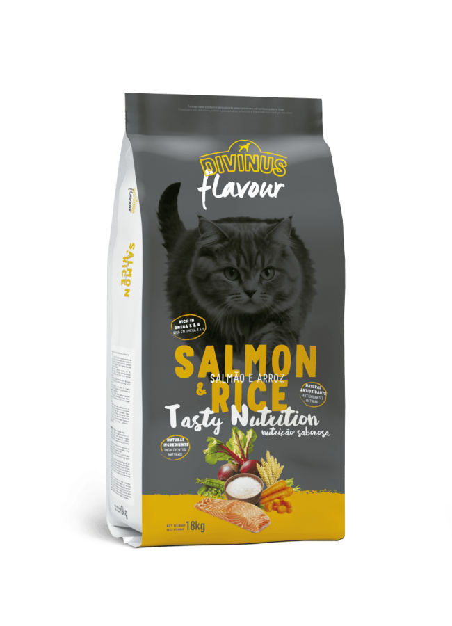 DIVINUS Cat Salmon & Rice-ը լիարժեք և հավասարակշռված չոր կեր է, որը մշակվել է չափահաս կատուների համար, հարմար է ստերիլիզացված, ներսի և դրսի կատուների համար՝ տարբեր ակտիվության մակարդակներով: Այն օգտագործում է կենդանական սպիտակուցը որպես առաջին բաղադրիչ, որը համակցված է սաղմոնի և բրնձի հետ՝ ապահովելու համար հեշտ մարսվող և համեղ կերակուր: