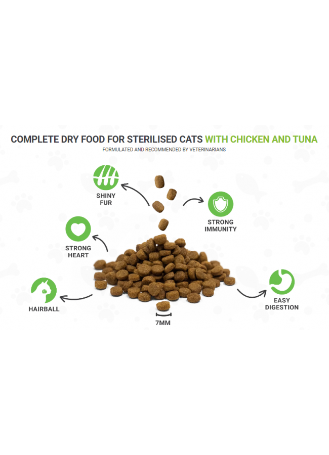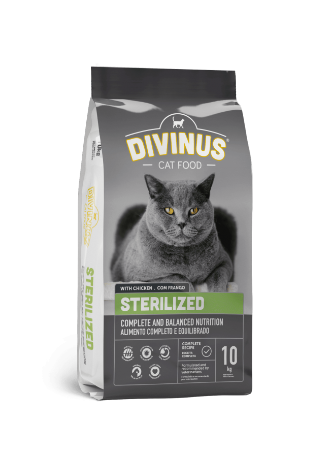 DIVINUS Sterilized-ը լիարժեք և հավասարակշռված չոր կեր է, որը մշակվել է ստերիլիզացված և տանը պահվող կատուների համար: Անասնաբույժների կողմից մշակված այն բավարարում է ցածր էներգետիկ պահանջարկ ունեցող կատուների սննդային կարիքները՝ օգտագործելով կենդանական սպիտակուցը որպես հիմնական բաղադրիչ և ուշադիր ընտրված բնական բաղադրիչներ: